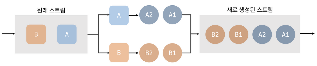 - 스트림에서 A라는 요소는 A1, A2 요소로 대체되고 B라는 요소는 B1, B2로 대체된다고 가정