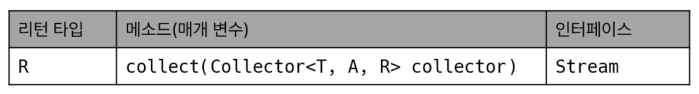 - Collector<T, A,, R>은 T 요소를 A누적기가 R에 저장한다는 의미