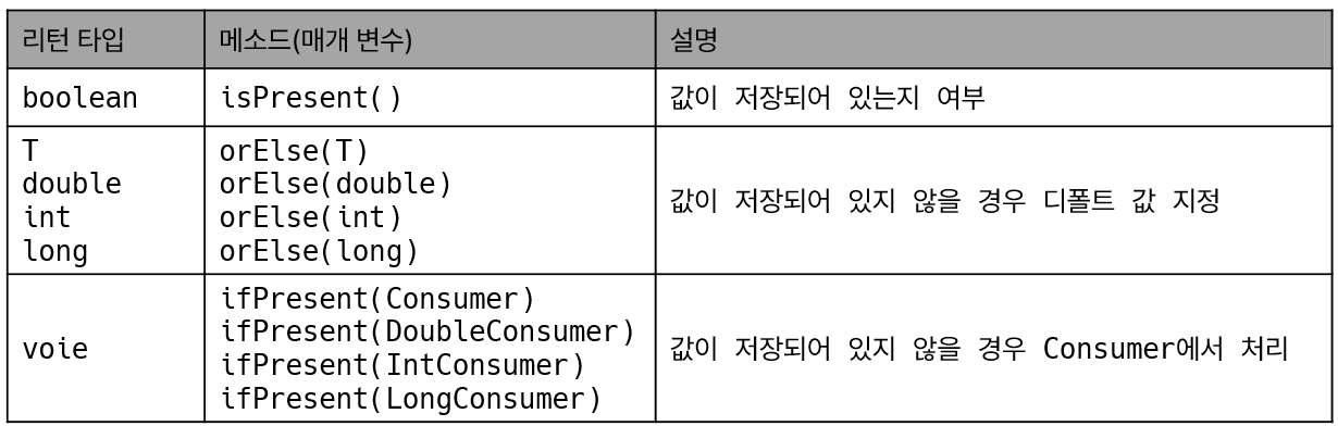- Optional, OptionalDouble, OptionalInt, OptionalLong클래스들은 저장하는 값의 타입만 다를 뿐 제공하는 기능은 거의 동일함