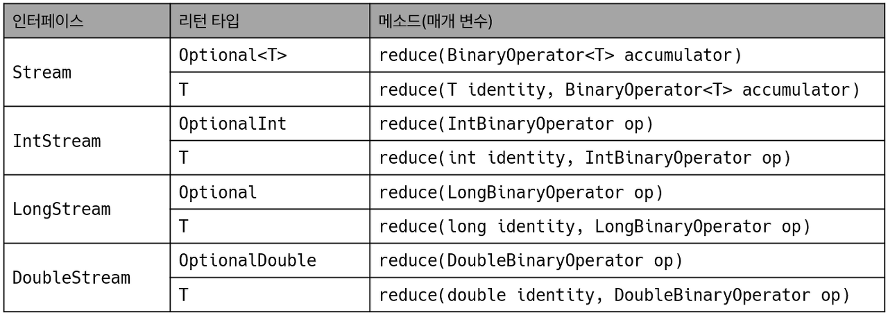 - 각 인터페이스에는 매개 타입으로 XXXOperator, 리턴 타입으로 OptionalXXX, int, long, double을 가지는 reduce() 메소드가 오버로딩