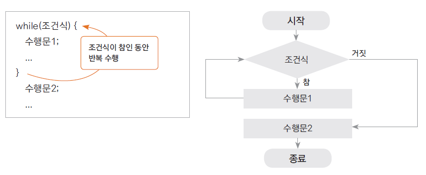 수행문을 수행하기 전, 조건을 체크하고 그 조건의 결과가 true인 동안 반복 수행합니다.