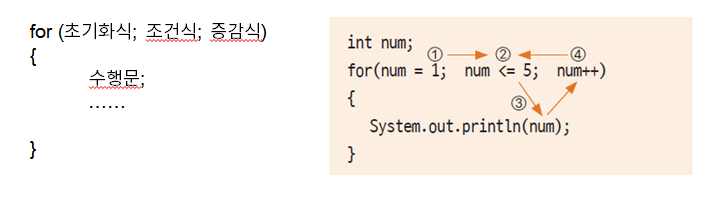 for문에는 초기화식, 조건식, 증감식이 있고 수행순서는 다음과 같습니다.