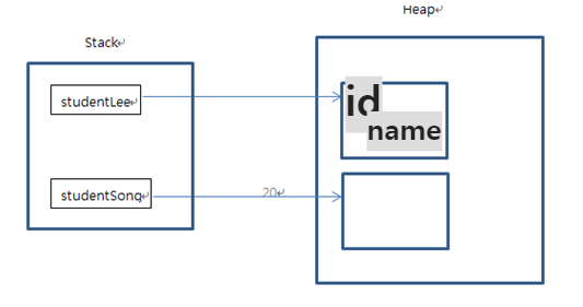 studentLee는 지역변수(참조변수)로 stack에 저장되고 이는 heap에 있는 인스턴스를 가리킵니다.