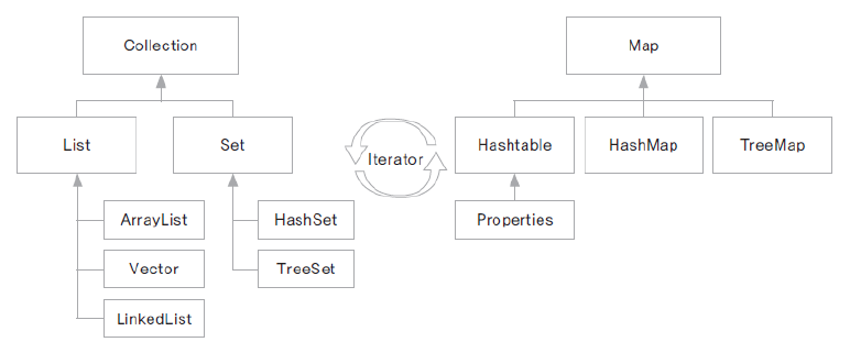 - HashTable, HashMap, Properties, TreeMap 등이 Map 인터페이스를 구현 함