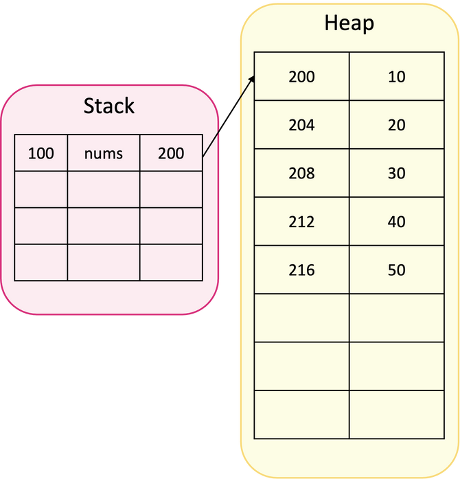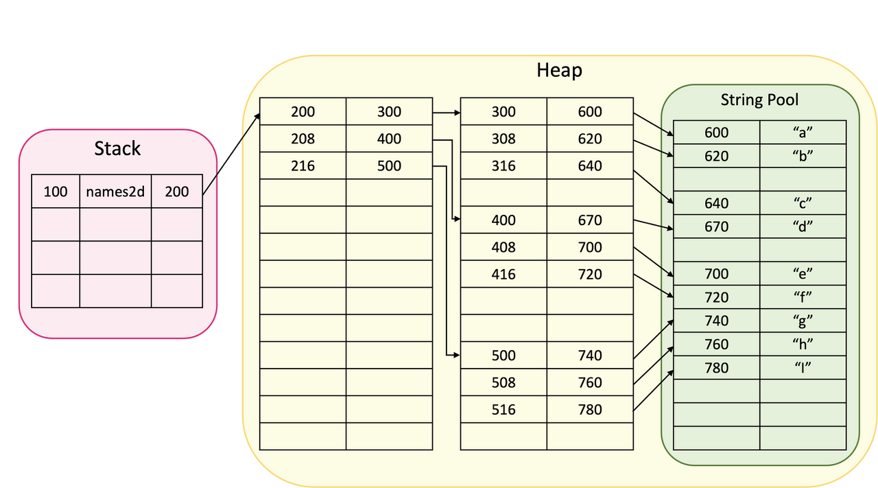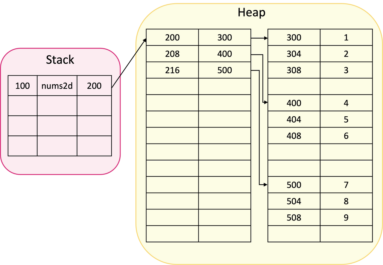 - int[] nums2d에는 실제 데이터의 주소가 배열로 저장되어 있음